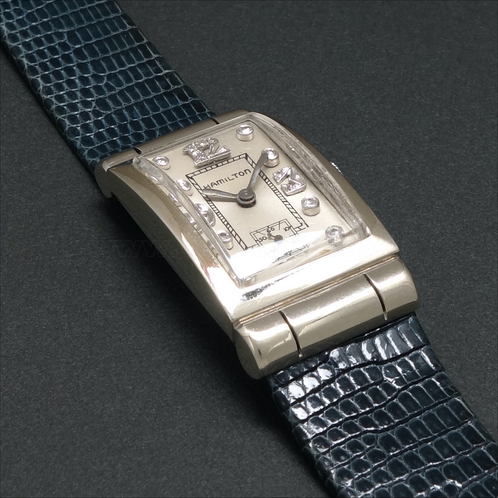 ベルトの付け根部分を覆う形のデザインが特徴的なフーデッドモデルで、14金ホワイトゴールドのトーンが上品さを感じさせる。ビッグアラビックインデックスにはダイヤモンドをあしらっており、当時としてはかなり高級なモデルだったはずだ。搭載されているCal.980は、後のハミルトンを代表するCal.982に連なるムーヴメント。17石のシンプルな設計だが、それだけにメンテナンス性が高いし、いまでもパーツが手に入りやすく安心して使うことができる。この豪華な仕様で20万円を切る価格はかなり魅力的だ。