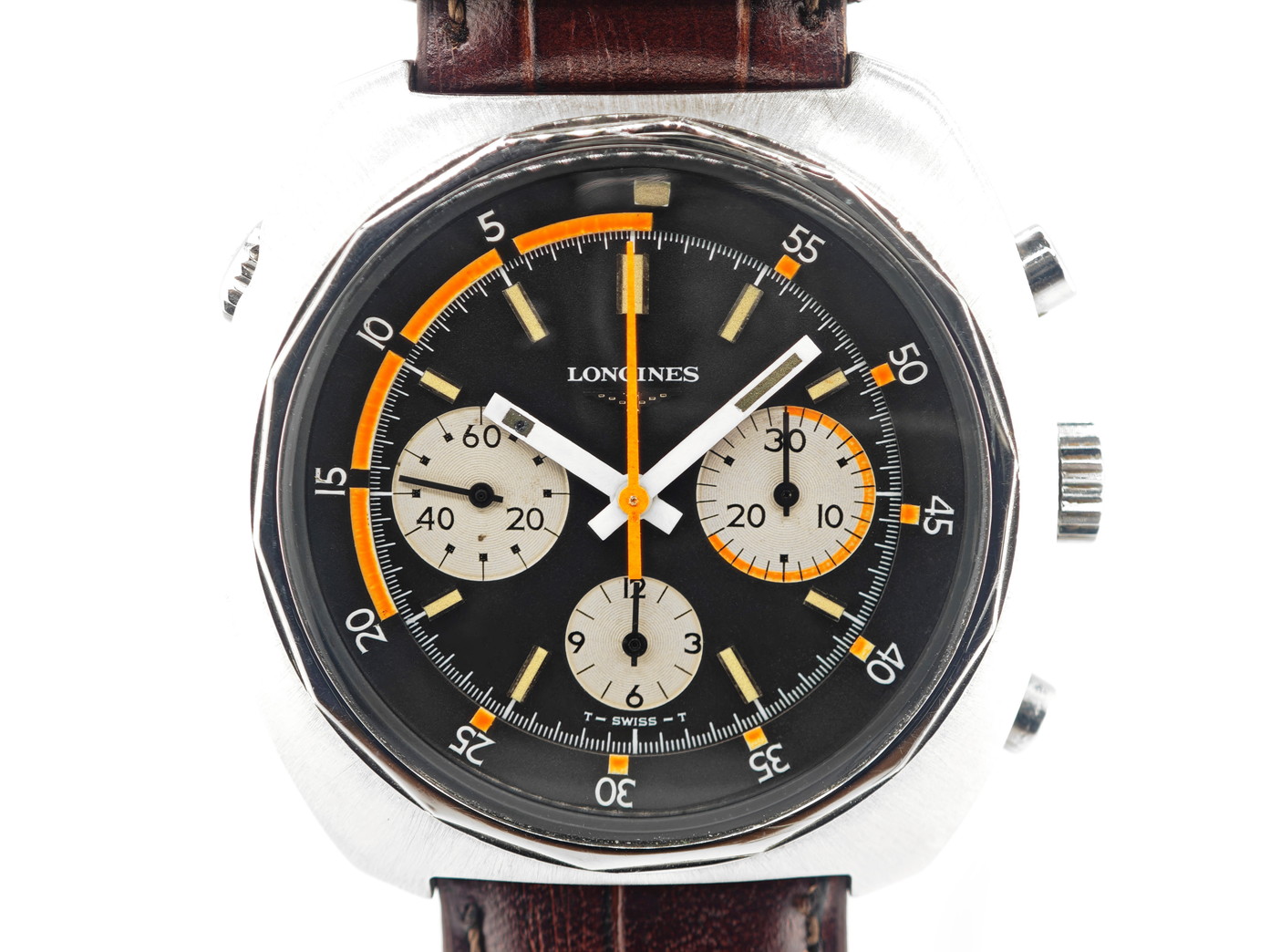 ブラックマットダイヤルに映えるオレンジゲージとクロノグラフ針。